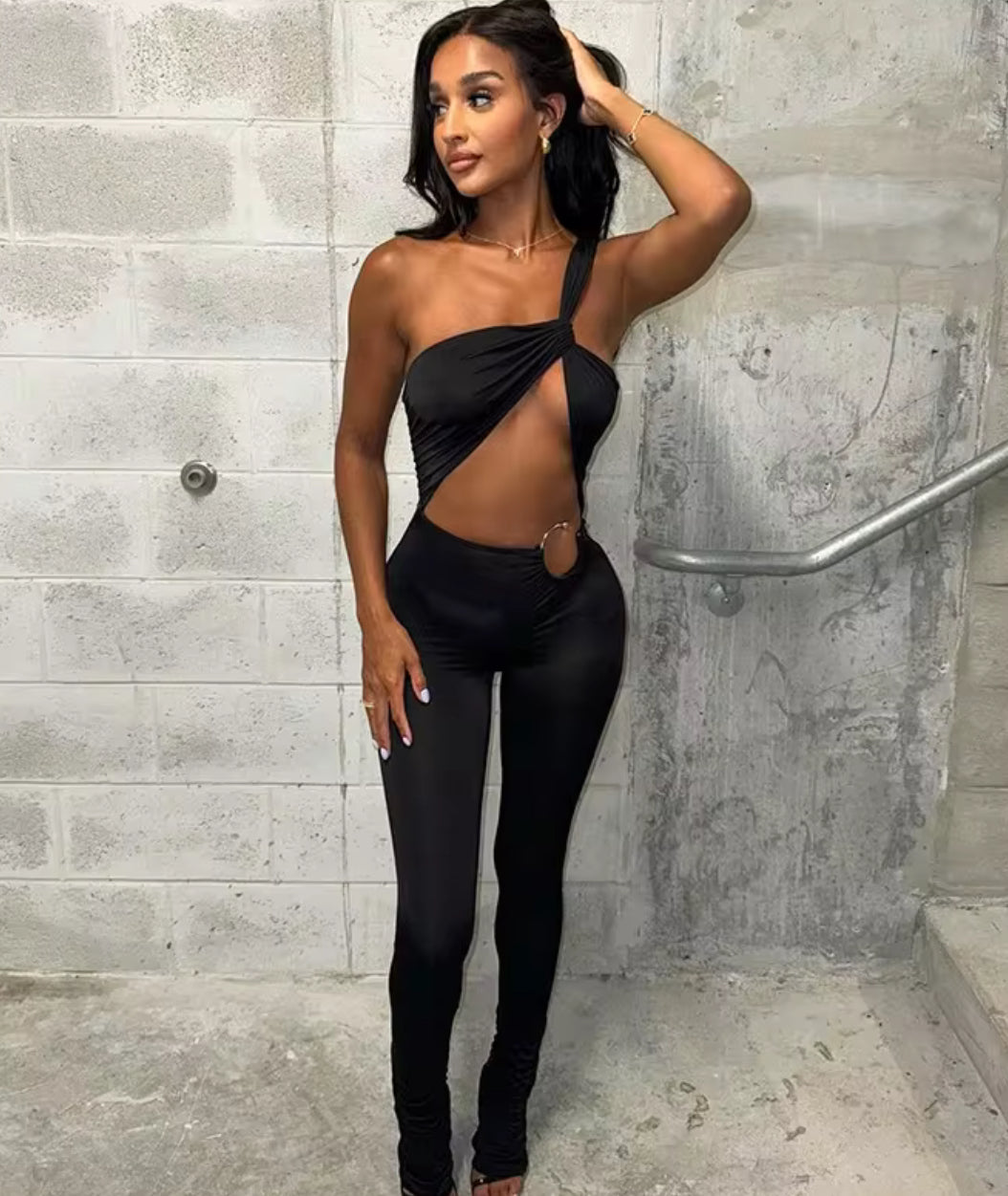 Unleash your daring side with this stunning black two-piece set that perfectly balances sexy and chic. The one-shoulder top features a daring cutout and a chic ring detail that draws attention to your curves, while the high-waisted leggings elongate your legs and add a sleek, confident vibe. Ideal for a night out or a special occasion where you want to turn heads and feel fabulous.